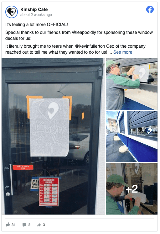 See the Facebook post from client Kinship Cafe, announcing the new logo created by BVA designer, Kyerra Williams, and tagline created by copywriter Grace Stephens.