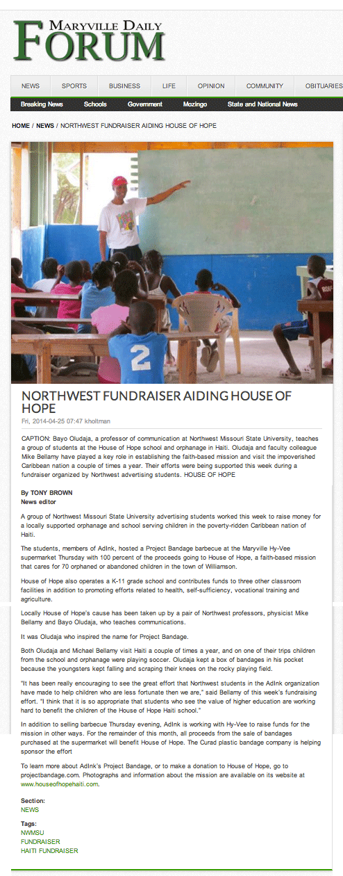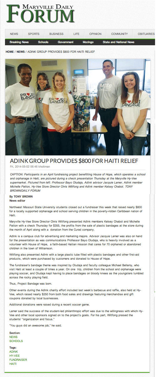 During the Spring 2014 term, AdInkers pulled off a major fundraiser called Project Bandage. The focus is to collect bandages for children at the House of Hope orphanage in Williamson, Haiti. This orphanage was started by Northwest professors Bayo Oludaja and Michael Bellamy, who visit the orphanage at least twice a year, always bringing supplies for the kids and the townspeople. The children have begun playing soccer on a new soccer field, but since grass is scarce in Haiti, the field is simply dirt, and some pebbles and rocks, too. This is one reason the children need bandages… thus, Project Bandage!